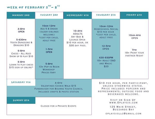 Hours can be found on our weekly calendar.